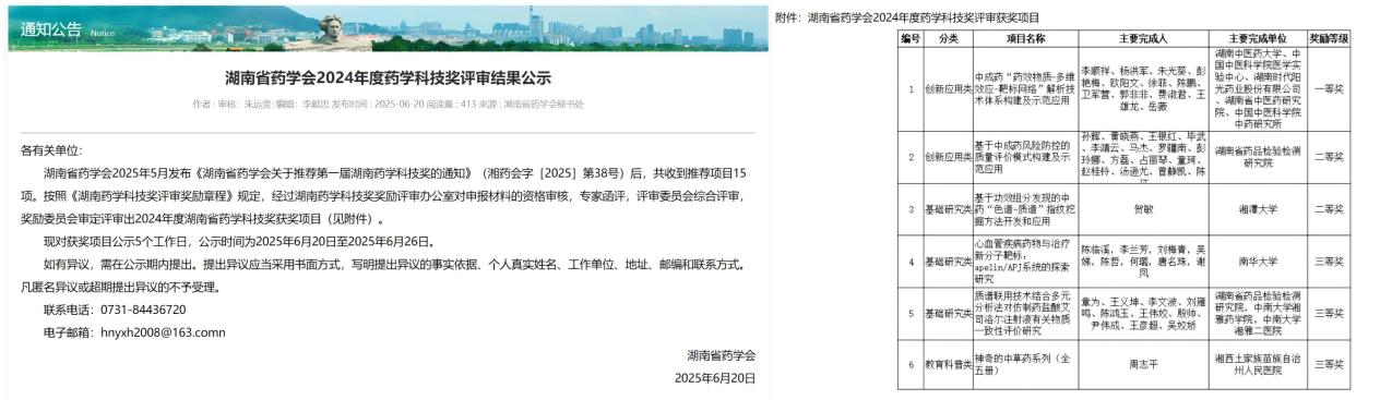 2025年6月,按照《湖南药学科技奖评审奖励章程》规定,经过湖南药学科技奖奖励评审办公室对申报材料的资格审核,专家函评,评审委员会综合评审,奖励委员会审定评审出2024年度湖南省药学科技奖获奖项目6项,予以公布。其中陈临溪教授带领的心血管分子靶标药理学新药创制团队以《心血管疾病药物与治疗新分子靶标,apelin/APJ系统的探索研究》项目荣获首届湖南省药学会2024年度药学科技奖三等奖。