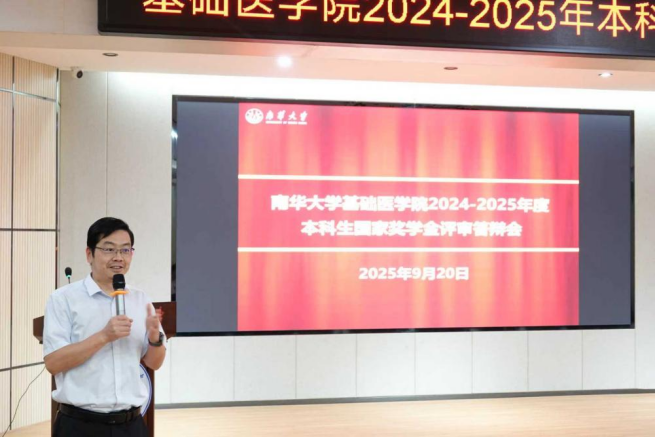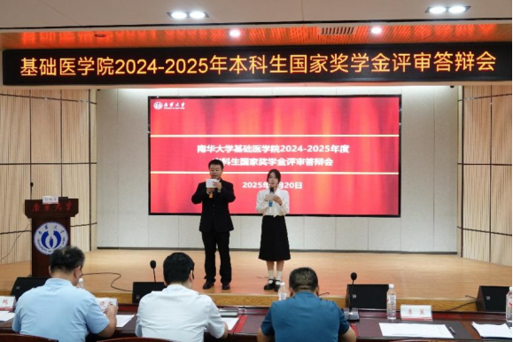 为切实做好一年一度的国家奖学金评审工作,做到公平、公正、公开,同时激发同学们向榜样学习的内生动力,9月20日下午,南华大学基础医学院在医研楼会议室举行2024——2025学年本科生国家奖学金评审公开答辩会,基础医学院党委书记曾国、基础医学院院长张晓东、基础医学院党委副书记卢清华、基础医学院组织学与胚胎学教研室曾鹏、南华大学附属第二医院霍佳雯、基础医学院学工室主任李翼,以及基础医学院各年级辅导员代表王雅嘉、廖敏、胡奉佳、夏泽华和学生代表、基础医学院团委副书记王诗玲共同担任评委。秉持“公平、公开、公正、择优”原则,本次评审答辩会采用线上线下相结合的形式同步开展,现场100余名同学和线上1.5万余名观众共同见证了精彩一幕。