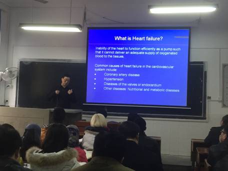 12月14日下午2:30,我校心血管疾病研究所聘请的湖南省“海外名师”、加拿大西安大略大学终身教授冯清平教授来我校给留学生作了题为“Heart failure:pathophysiology and pharmacological treatment”示范性英语教学。