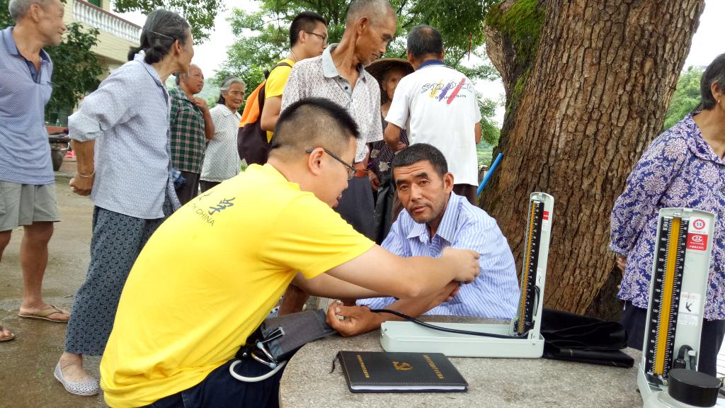 7月4日下午,南华大学医学院2016年大学生暑期“三下乡”社会实践服务团在永州市祁阳县大村甸镇五塘冲村开展义诊工作,为当地村民看病解疑,测量血压,讲解医学常识,发放调查问卷。