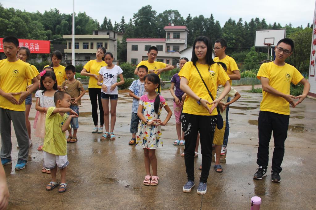 “感恩的心,感谢有你,伴我一生,让我有勇气做我自己。感恩的心,感谢命运,花开花落,我一样会珍惜。”上午9点,服务团支教组队员们早早地来到五塘冲村活动中心前坪,教当地的留守儿童学唱《感恩的心》。队员们手把手教孩子们一边唱歌一边做手语,耐心地纠正孩子们的每一个发音和动作,大家的歌声和笑声洋溢着整个前坪。