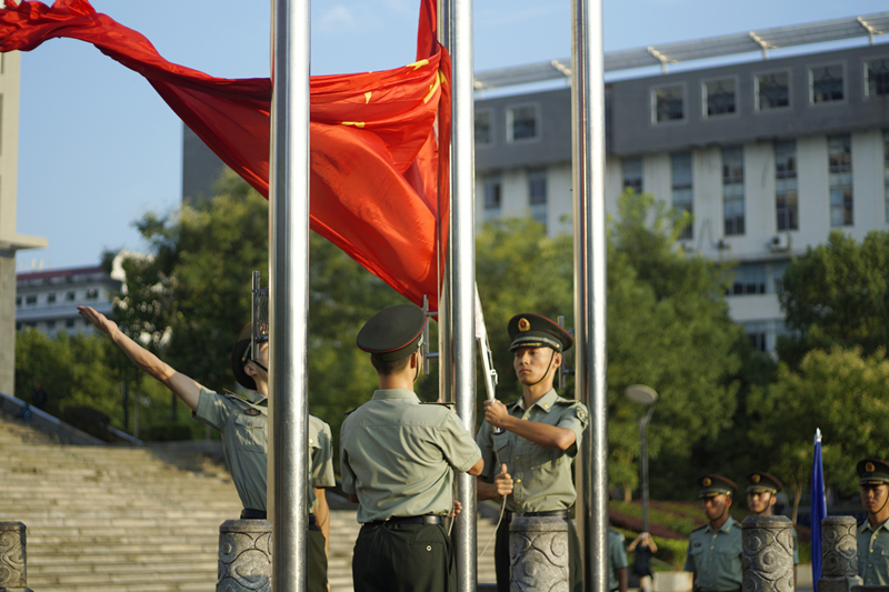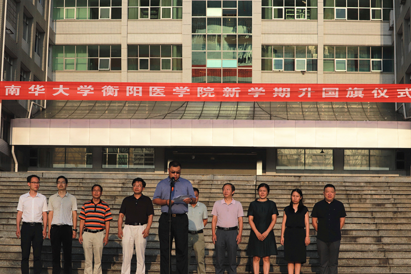 伴随着慷慨激昂的国歌、校歌,在国旗班护卫下五星红旗、校旗冉冉升起。2016级学生代表余雪婷在国旗下宣誓:“作为医学生,我们将谨记医学生誓言,不忘初心,砥砺前行;作为新南华大学衡医人,我们身上与从前相比多了一份传承的责任,让我们为发扬衡阳医学院精神而努力奋斗!”
