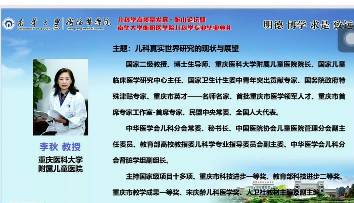 重庆医科大学附属儿童医院院长李秋教授作《儿科真实世界研究的现状与展望》讲座,她首先简单地为大家介绍了重庆医科大徐附属儿童医院的历史与内涵,之后详细讲解了真实世界研究的定义、真实世界研究与随机临床试验的比较、儿童真实世界研究现状、真实世界研究的挑战与具备的基础、重医儿童医院真实世界数据研究基础。