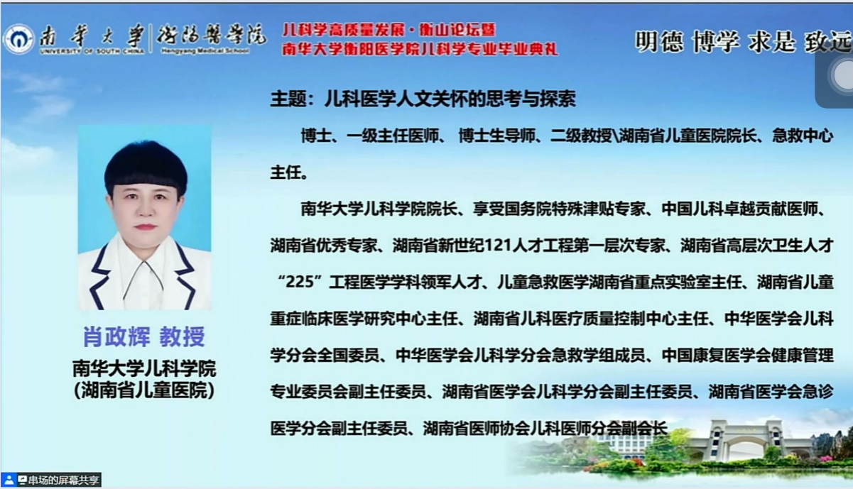 南华大学儿科学院(湖南省儿童医院)院长肖政辉教授作《儿科医学人文关怀的思考与探索》讲座,她对毕业生们讲解了儿科医学人文关怀的现状、内涵、实践与探索。她指出选择大爱就是选择对人性的尊重。医学是生命与生命的对话,其本质就是对生命的终极关怀。当我们用人文关怀撑起医学的天空时,这片天才能回到本源本色。