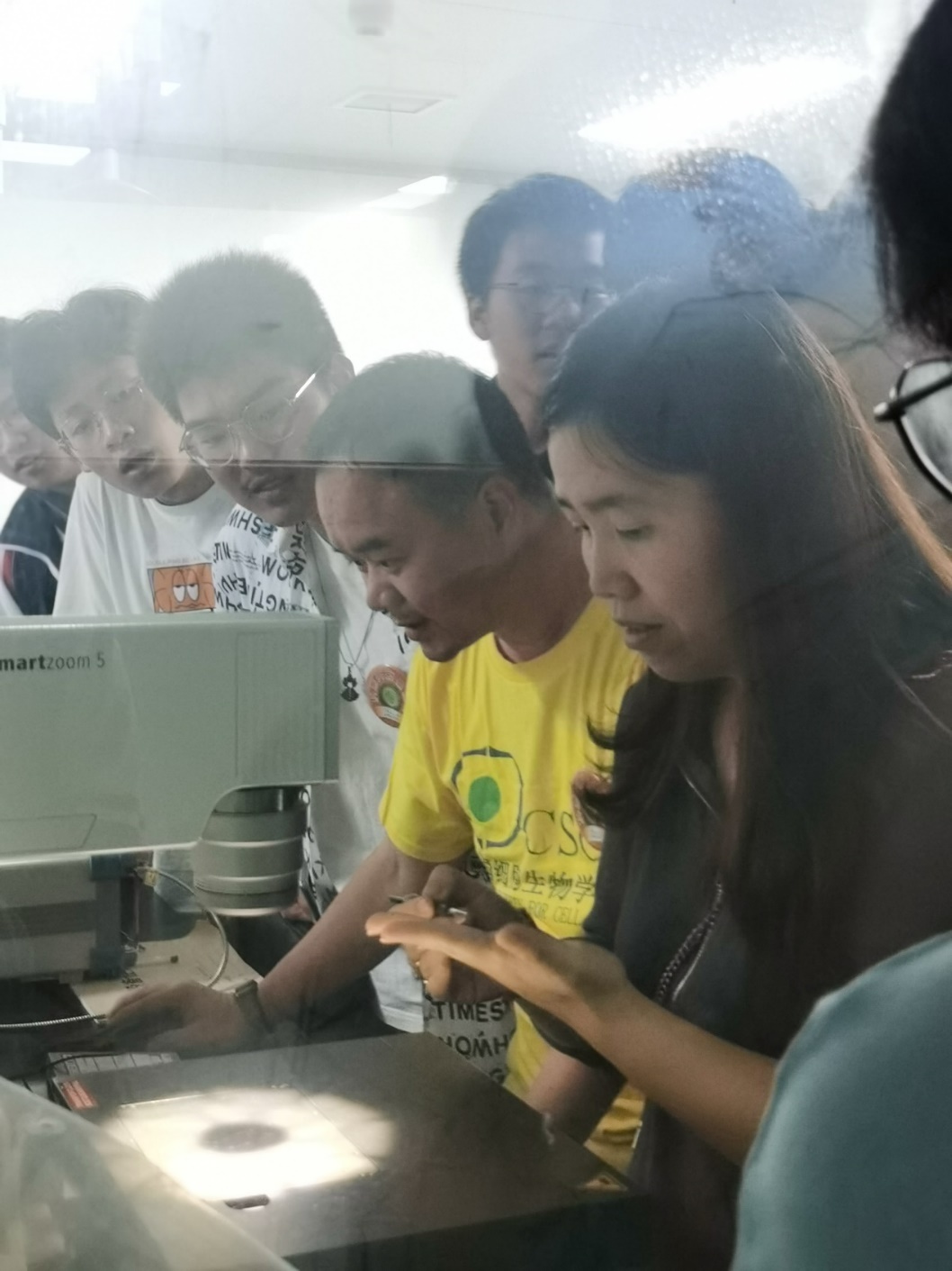图9王成昆副教授和唐艺菲老师示范使用3D超景深显微镜观察果蝇性状