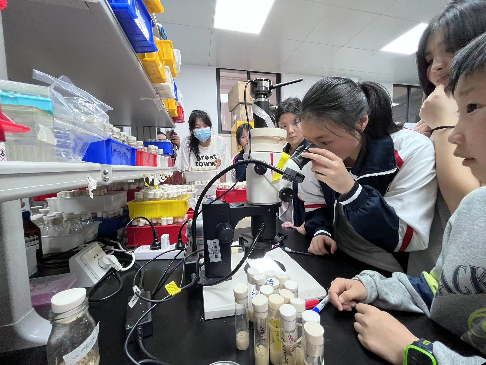 图6硕士生肖莹指导学生观察果蝇性状
