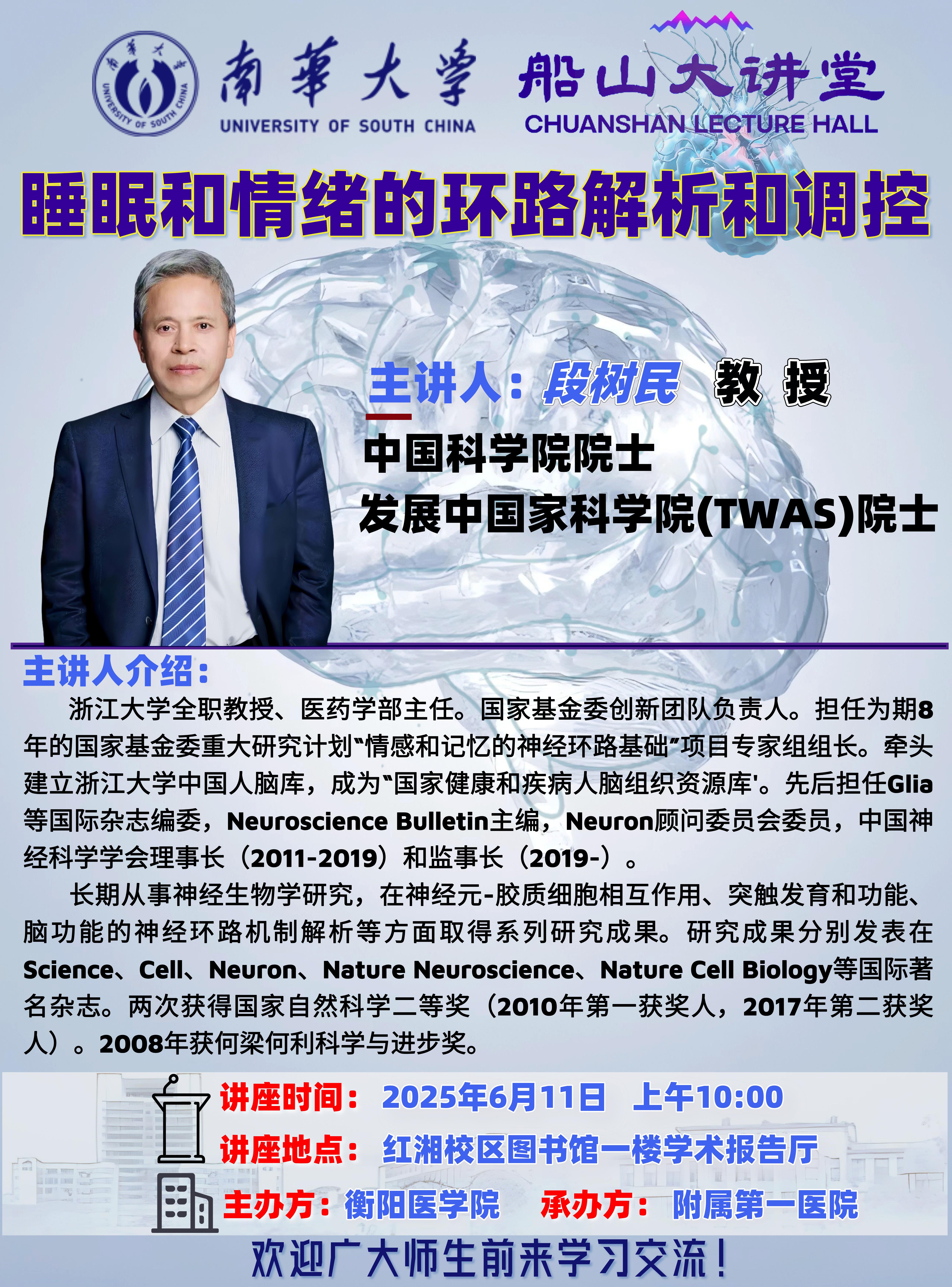 船山大讲堂 | 段树民院士:睡眠和情绪的环路解析和调控