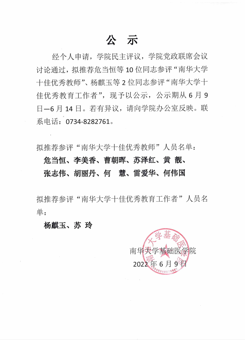 基础医学院关于推荐危当恒、杨麒玉等老师参评南华大学十佳优秀教师、南华大学十佳优秀教育工作者的公示