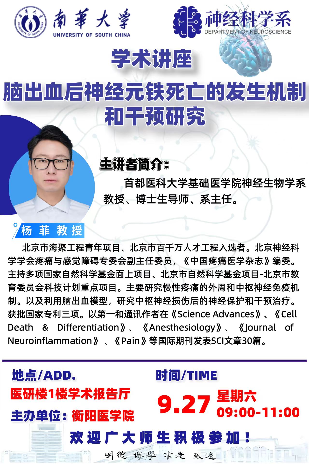 学术讲座|脑出血后神经元铁死亡的发生机制和干预研究