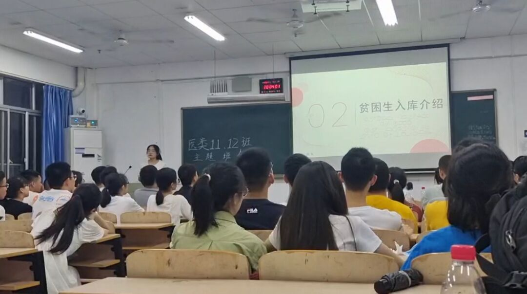9月3日晚19,00,暑期资助宣传大使熊宇薇在2022级新生第一次班会上,进行了资助政策的宣传,并重点讲解了贫困生入库工作。