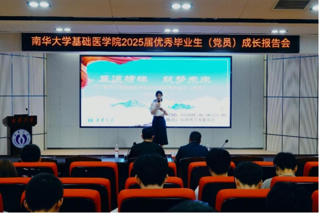 为宣传优秀毕业生(党员)先进事迹,帮助低年级同学借鉴他们的成功经验,合理规划大学生涯,最终成为一名德智体美劳全面发展的新时代优秀青年,5月28日晚,南华大学基础医学院2025届优秀毕业生(党员)成长报告会在医研楼学术报告厅顺利举办。基础医学院党委副书记卢清华、团委书记金锦涛出席,易奇龙、刘凌云、唐慕尧、银金玉、谭文慧五位优秀毕业生党员代表分享成长故事,23、24级学生代表现场聆听。