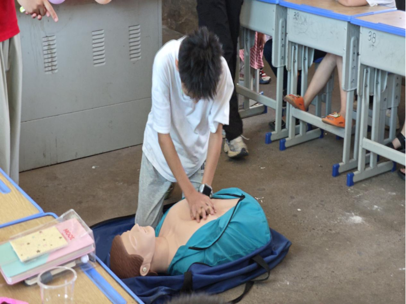 活动现场,志愿者陈疆、王彭梓宸化身“安全小导师”,围绕留守儿童日常生活中易遇的溺水、异物卡喉等安全隐患,聚焦心肺复苏、海姆立克急救法两大核心技能展开教学。陈疆用孩子们听得懂的语言,结合农村常见场景举例:“如果小伙伴在池塘边玩耍时不慎落水,上岸后没有呼吸,我们要这样做……”生动讲解了人工呼吸的操作要点和异物卡喉时的自救互救技巧;王彭梓宸则借助专业假人模型,一步一分解演示心肺复苏的按压深度、频率等关键细节,手把手纠正孩子们的动作,让抽象的知识变得可触可学。