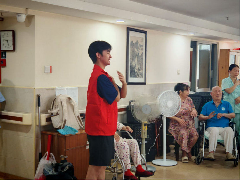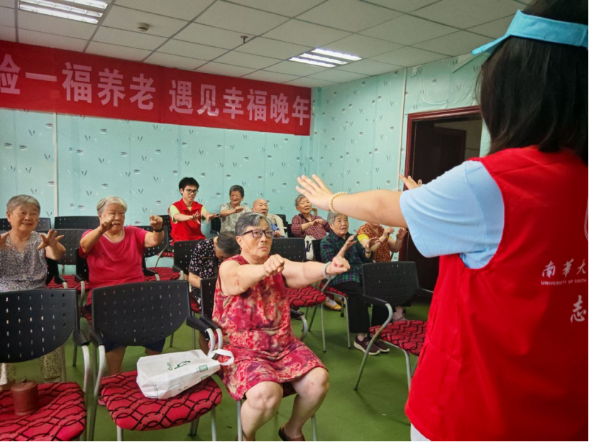 针对不同群体需求,活动设计凸显精准化服务:针对轮椅老人编排坐姿简易版手指操,通过握拳、伸展等动作强化上肢协调;为老年大学学员融入经络按摩教学与睡眠健康科普,将养生知识融入手势律动;对认知障碍群体则采用“一对一”模式,用爱陪伴老人。志愿者们结合基础医学知识,在《红星闪闪》的旋律中带领老人比划红星轨迹,既通过肢体训练预防老年疾病,又以红色文化凝聚情感共鸣。两日间,福利院活动室内始终洋溢着银发与青春交织的活力,老人们或专注跟练,或主动合唱,指尖跳跃的不仅是动作,更是跨越代际的温情传递。