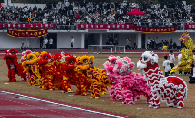文体表演时,基础医学院的舞龙舞狮表演“龙腾盛世”惊艳亮相,伴随着乐曲,巨龙腾空而起,时而盘旋飞舞,时而翻转腾跃,龙身流光溢彩,龙头灵动逼真,每一个动作都刚劲有力且飘逸自如。憨态可掬的舞狮也摇头摆尾、蹬腿跳跃,时而与观众互动,时而昂首挺胸尽显威武。舞龙舞狮队员们默契无间,将刚劲之力与柔美之姿完美交融,既彰显了中华传统文化的独特韵味,更传递出南华学子昂扬向上、奋勇拼搏的精神风貌。紧接着基础医学院与经济管理与法学学院带来的军训操活力迸发,为现场注入别样青春活力。音乐响起,学子们迅速列队就位,动作整齐划一又不失灵动。队形变换间,时而化作整齐的方块阵,时而宛如流动的迷彩浪潮,伴随着激昂的旋律,将‘青春无畏、奋勇争先’的信念展现得淋漓尽致。