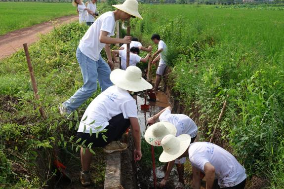 活动现场,服务团成员戴上黄色草帽,扛起锄头铲子,来到田间地头沟渠中,和当地村民一起开展清淤除草。绿秧摇曳,锄头翻飞,田埂上笑声、欢呼声、劳动号子声连绵不绝。虽然天气炎热,不少队员的队服都被汗水打湿甚至还沾了淤泥,但每个人的脸上都洋溢着满足的笑容。在队员和村民的团结协作下,经过2个小时的努力,清理任务顺利完成。蓝天白云下,大家滴落的是汗水,飞扬的是青春,收获的是整洁。“像是在田野里上了一堂生动的实践课!”一名服务团成员在参加劳动实践后发出的感慨。“离开时,看到还有不少村民顶着烈日在田里面劳作,我明白幸福生活来之不易,希望我们也能学好知识,将来更好地服务社会、报效祖国。”