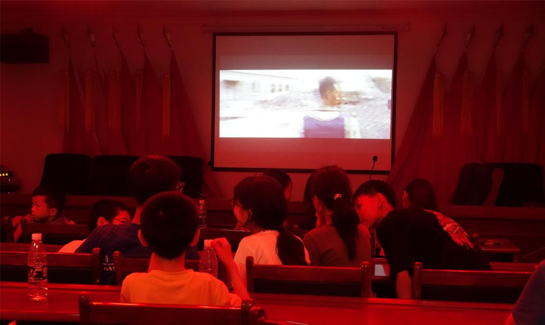 6月29日晚,服务团成员带领孩子们共同观看红色电影《万里归途》。当孩子们遇到看不懂的情节时,服务团成员耐心细致地小声为他们解答背后的含义。
