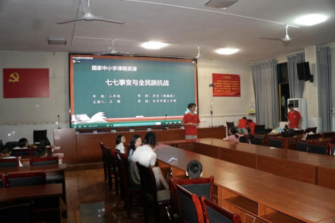 7月7日,活动在“欢乐启航,历史铭记”主题下拉开序幕。一场别开生面的丢沙包游戏,如同初升的太阳,瞬间点亮了服务中心的每一个角落,服务团的成员们与孩子们的距离被迅速拉近,为接下来活动的开展打下坚实基础。随着夜幕的缓缓降临,活动的氛围悄然转变。在静谧而庄严的氛围中,一场关于“七七事变”的历史小课堂缓缓展开。服务团的成员们以严谨的态度,通过播放历史学习视频、进行深入的互动问答,引导孩子们穿越时空,走进那段沉痛而坚韧的历史。孩子们在沉思与学习中,不仅深刻理解了国家曾经的苦难与抗争,更在心中种下了“勿忘国耻,振兴中华”的坚定信念,让爱国情怀在他们心中生根之发芽。