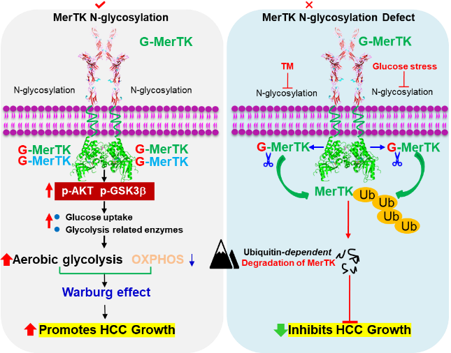 该研究揭示了Mer受体酪氨酸激酶(MerTK)N-糖基化修饰调控肝癌生长的分子机制。研究发现,MerTK可以促进肝癌细胞能量代谢从线粒体氧化磷酸化到糖酵解的代谢重编程,进而促进肝癌细胞的增殖。研究进一步发现:N-糖基化有利于MerTK形成同二聚体或异二聚体,进而增加其稳定性;该研究还鉴定了天冬酰胺294和454是发生糖基化的关键位点,天冬酰胺294和454糖基化对于MerTK蛋白的稳定十分关键。研究进一步揭示了MerTK入核对于肝癌细胞在营养匮乏(如葡萄糖饥饿)等应激条件下的存活极为关键。该研究为以MerTK作为靶点治疗肝细胞癌提供了新的策略,同时也首次阐明了MerTK是一个潜在的肝细胞癌预后标志物。该研究是吕斌研究员团队继2014年与美国Rutgers大学Birge和Kotenko教授团队合作发表在JBiolChem上有关MerTK可以驱动上皮癌细胞的Efferocytosis(胞葬作用)并通过诱导肿瘤细胞PDL-1的表达进而使肿瘤细胞逃避免疫系统的监视,促进肿瘤发展的创新性发现之后的又一新成果。