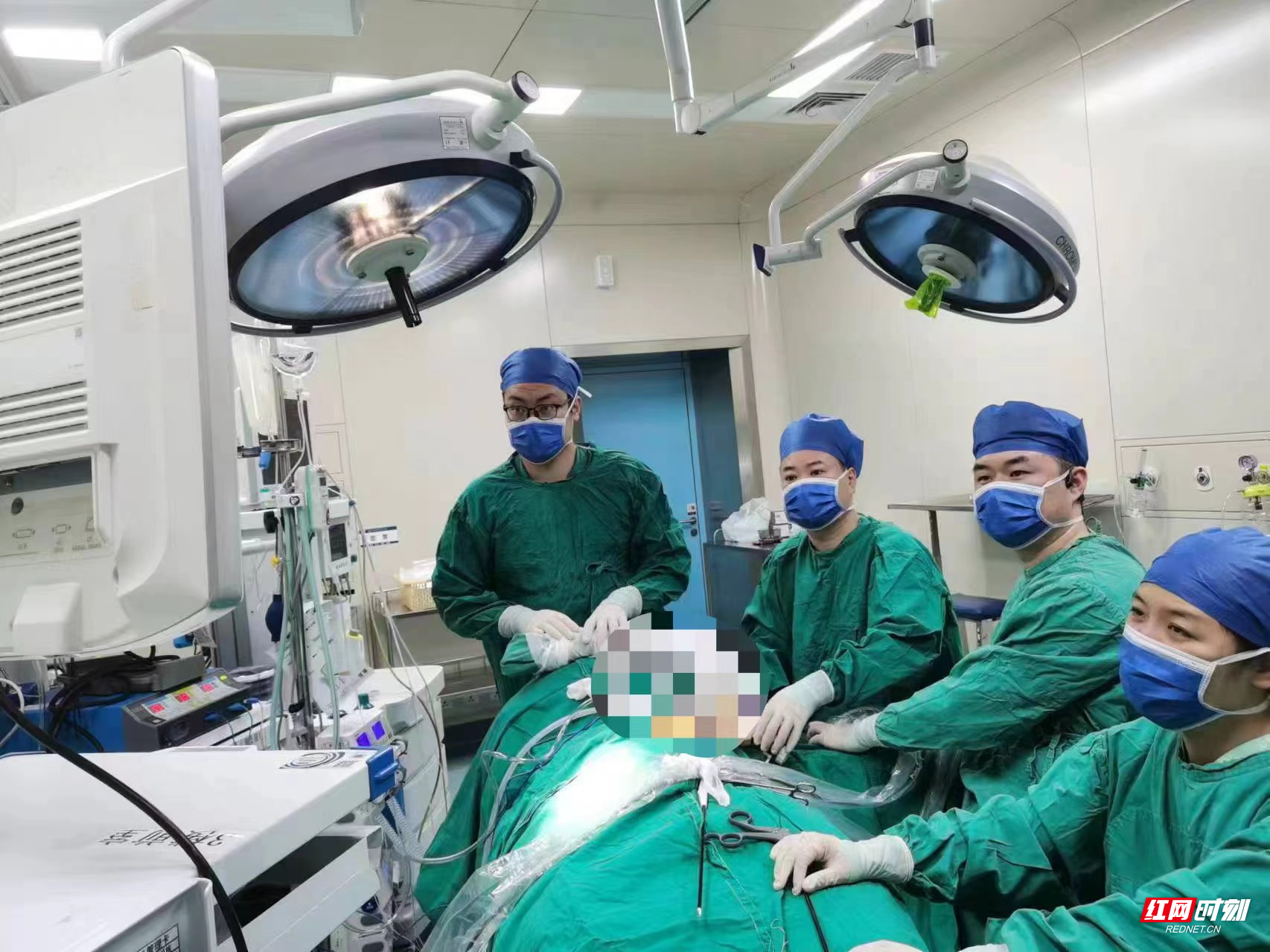 乳甲外科团队正在为患者实施腔镜微创乳腺癌根治术。